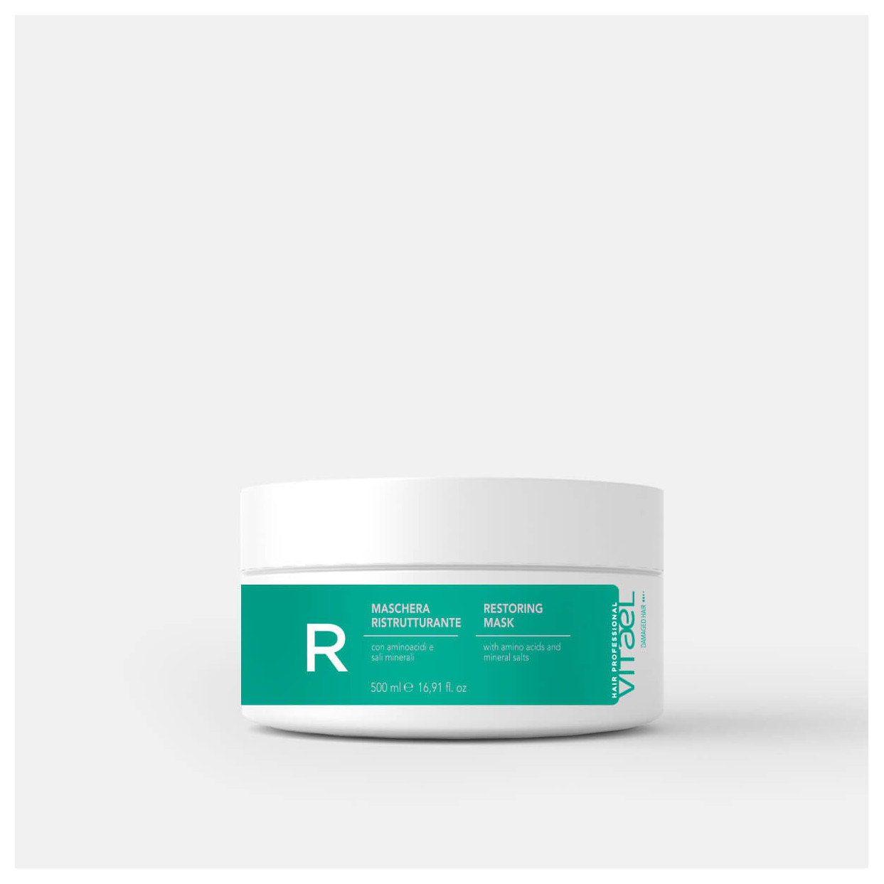 RESTORING MASK WITH AMINO ACIDS AND MINERAL SALTS. Reconstruction mask for the deep and long lasting treatment of weak, dry and damaged hair. Formulated with a new active complex based on amino acids, keratin and mineral salts that restore the cellular cohesion, it repairs and reinforces the hair fiber from the inside out. Adds immediate strength, shine and silky touch.